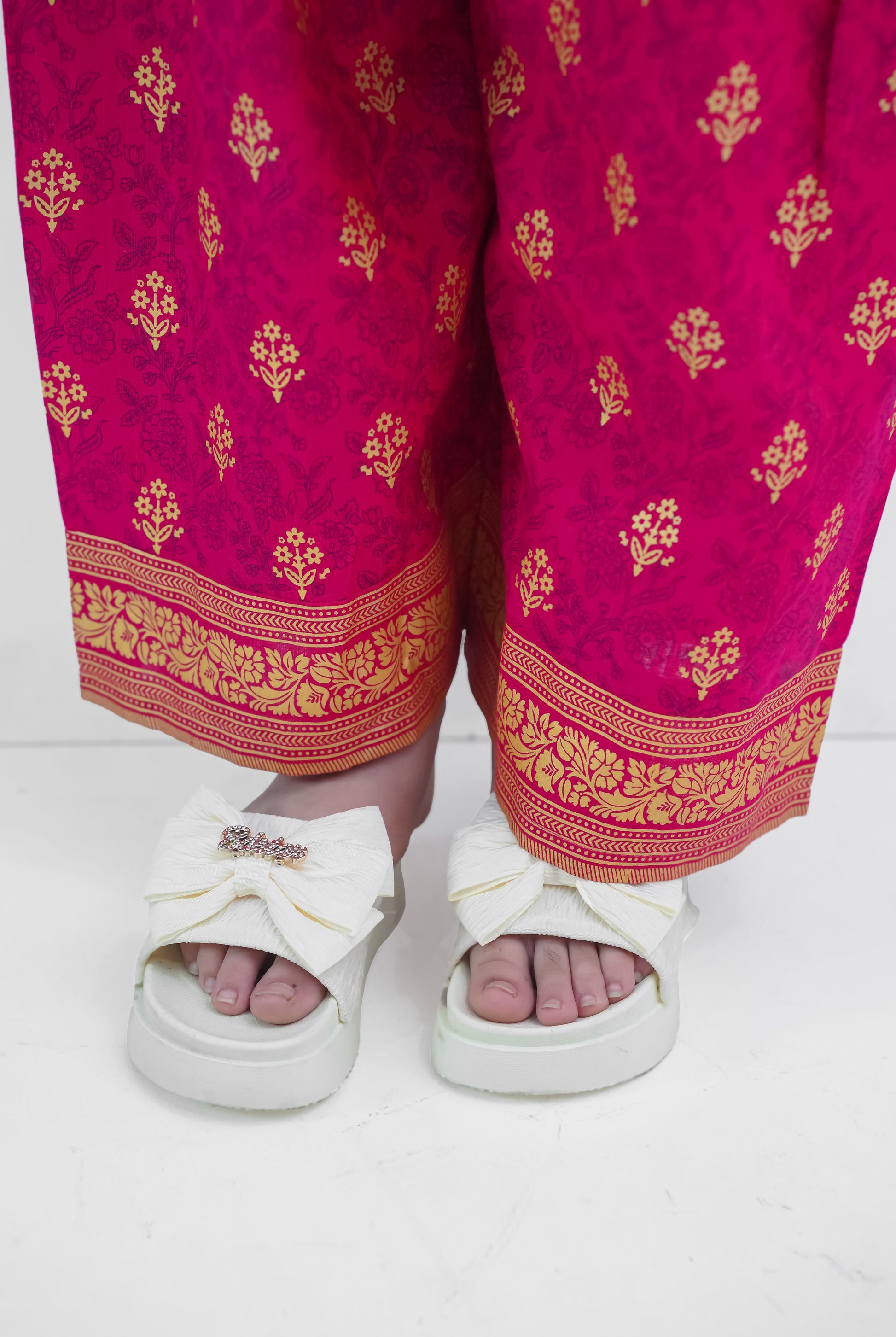 This elegant handmade girls' kurta set from our Winter Collection blends warmth with style. Crafted in a rich magenta tone, the kurta features detailed golden embroidery on the neckline and sleeves, paired with wide-leg embroidered trousers for a traditional yet comfortable fit. Made with care, this outfit is perfect for festive gatherings, family occasions, and winter celebrations.