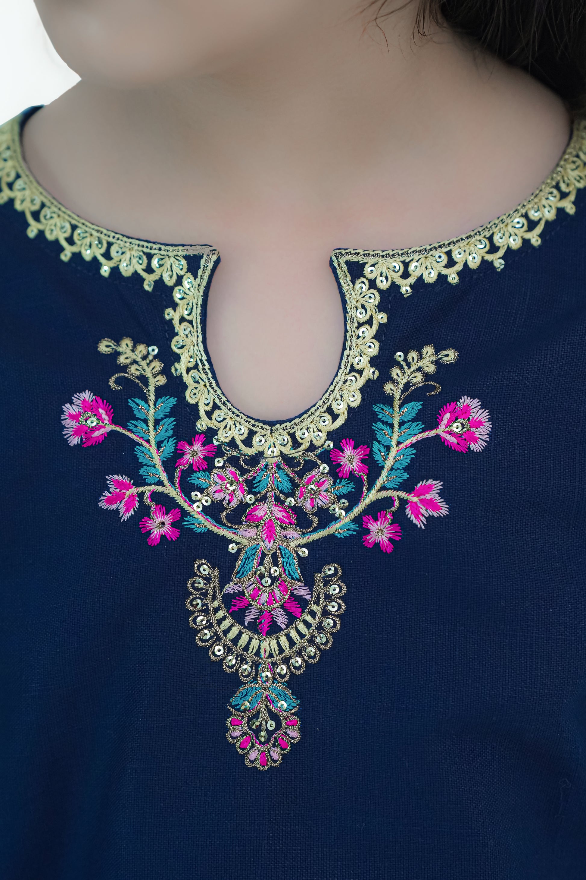 Add elegance and warmth to your little girl’s winter wardrobe with this navy blue embroidered kurta trouser set. Designed from soft winter fabric, it combines comfort with traditional charm. The kurta is beautifully adorned with intricate floral embroidery along the neckline, hem, and side panels, while the wide-leg trousers feature delicate embroidered detailing at the bottom. This graceful outfit is perfect for winter festivities, cultural occasions, or family gatherings, ensuring your girl stays stylish and cozy all season long.